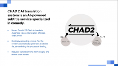これらを解決するために開発された「CHAD 2」は、コメディ独自の構造を理解するAI字幕生成システムで、「フリ」や「オチ」などの特有の展開、方言や業界用語に対応する辞書、そして字幕の長さ調整による可読性の最適化といった機能を備えている。コメディ作家による監修も取り入れられ、実際の字幕生成に深く関与している。