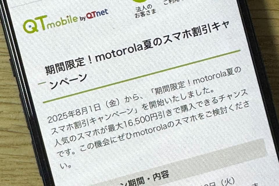 QTnetは、運営するMVNOサービス「QTモバイル」で「期間限定!motorola夏のスマホ割引キャンペーン」を実施している。期間は9月30日まで。