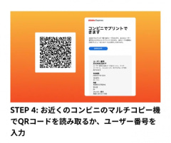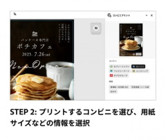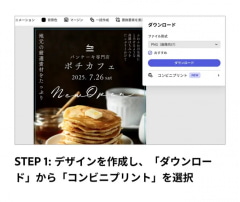 Adobe Expressで作成し、「ダウンロード」から「コンビニプリント」を選ぶことで、QRコードとユーザー番号が生成される。これを利用し、全国のセブン-イレブン、ファミリーマート、ローソン、ミニストップ、ポプラグループの店舗に設置されたマルチコピー機で印刷できる。
