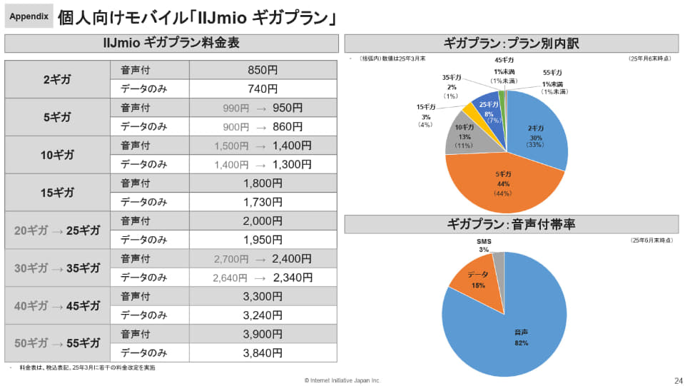 資料には、2025年3月末の数値も掲載されており、たとえば2ギガプランは33%→30%に、5ギガプランは44%→44%(変わらず)、10ギガプランは11%→13%、15ギガプランが4%→3%、25ギガプランが7%→8%、35ギガプランが1%→2%と、もっとも少ない2GBのユーザーが減少し、大容量のユーザーが増える傾向にある。