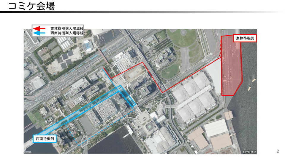 コミックマーケットでは例年、会場内へ入る待機列が施設の東側と西側に発生し、相当の混雑となる。局所的な人口の集中は、携帯電話ネットワークが混雑し、うまく通信できなくなる原因になる。