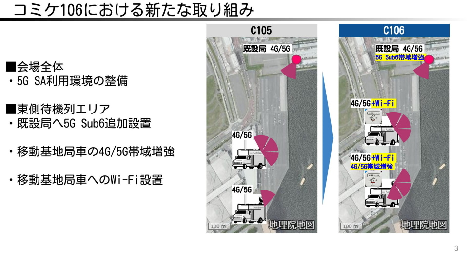 コミックマーケットの会場となる、東京ビッグサイト付近にすでに設置されている基地局に対して、5G(Sub6、3.9GHz帯、100MHz幅)の帯域幅を増強。電波の帯域幅は大きいほど、多くのユーザーを収容でき、混雑した場所でも安定した通信の利用が期待できる。増強された基地局は、東側の待機列付近に位置する。