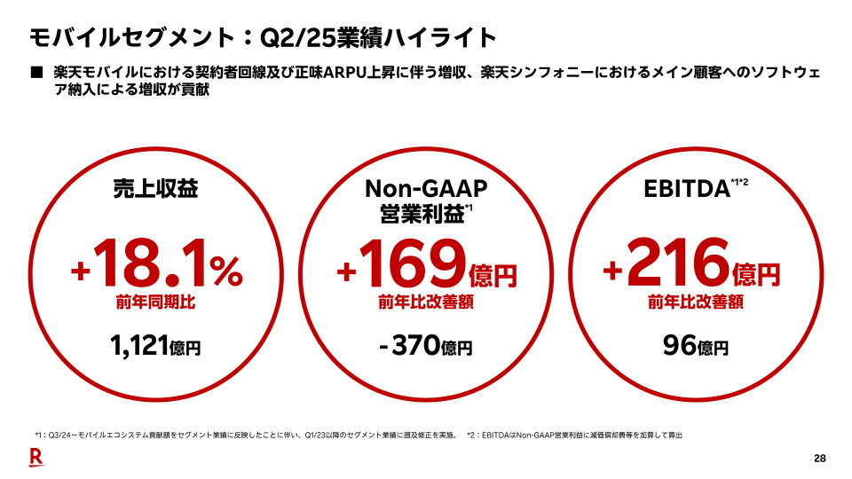 モバイルセグメントの売上収益は前年同期比18.1%増の1121億円となり、楽天モバイルと楽天シンフォニーがともに堅調に成長した。営業利益は依然として赤字だが、前年同期比で169億円改善。セグメントベースのEBITDAは216億円改善し、96億円の黒字に転じた。