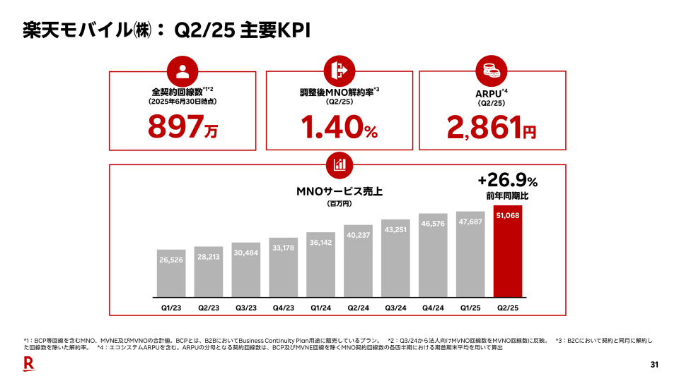 契約回線数は順調に増加し、7月7日に900万回線を突破。7月31日時点で908万回線となった。第2四半期のMNO純増数は39.3万回線で、解約率と回線数増加の両面で改善が見られた。解約率は第2四半期平均で1.4%、直近の6月には1.26%まで低下しており、ユーザーが定着しつつあると評価している。下半期は純増ペースをさらに加速させ、早期の1000万回線突破を目指す方針。