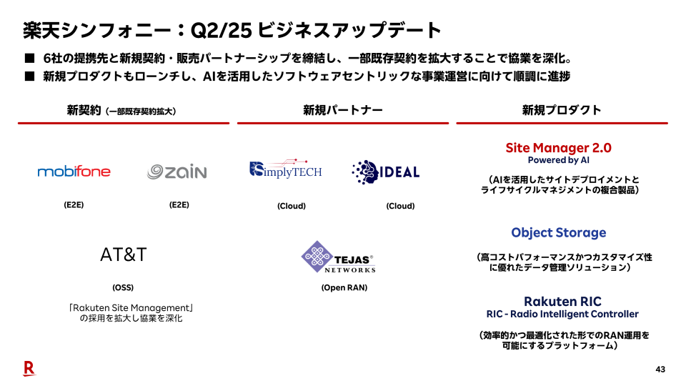 楽天シンフォニーは第2四半期に新たに6社と契約やプロダクト販売パートナーシップを締結。特にAT&Tによる「Rakuten Site Management」の採用拡大は、通信業界での評価向上を示すものとした。Open RANのソフトウェアベンダーとしての地位確立を目指し、新プロダクトの投入も進めている。