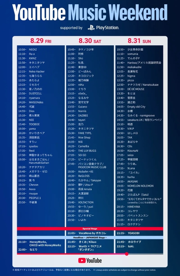 YouTube Music Weekend、29日~31日開催 アニメ・ネットカルチャー中心に122組が集結