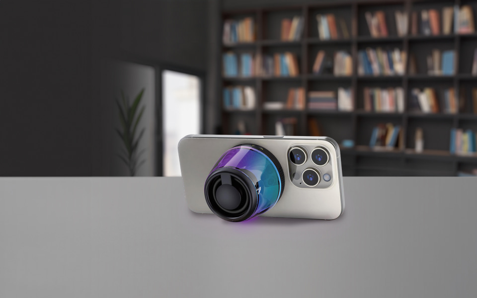 「Bluetoothマグネットスピーカーmini」は吸着型のスピーカー。付属のマグネットで、MagSafe対応のiPhoneに取り付けられる。取り付けた後は、スマホスタンドとしても使える。