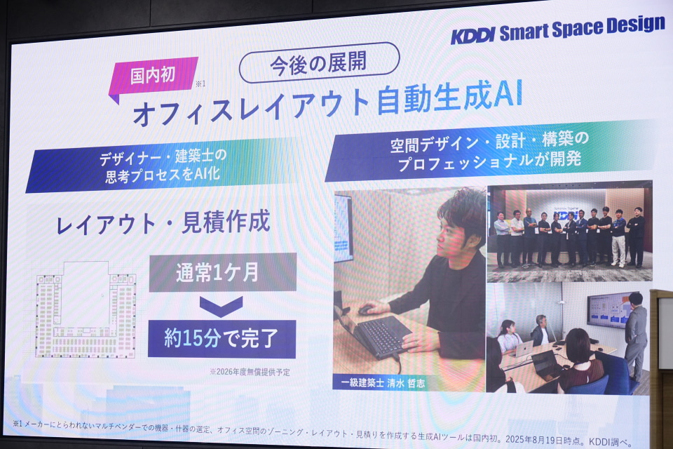 今後、オフィスレイアウトを生成する「オフィスレイアウト自動生成AI」を提供する予定。項目を入力するだけで建築の専門知識がなくともレイアウト・見積の作成が可能で、通常1カ月を要する作業が15分程度で終わる。2026年度の無償提供を予定している。