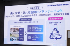 監視カメラやセンサー情報などから、会議室の数や什器の数などそれぞれのオフィス環境にあわせて内容をアップデートしていくことも検討する。将来的には、KDDI Smart Space Designで提供する内容を、空間の「プランサービス化」として、オフィスの仕様を標準化、通信・ロボットの動線などをあわせて、月額制で提供することも視野に入れる。
