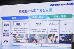 テクノロジー前提のコンセプト策定・設計により、オフィス完成後にWi-Fiを導入できない、ロボットが走行できないといったトラブル・再工事の発生を防ぐことができる。KDDIが工程を管理し、58社のパートナー企業とともに、工事や什器設置などを行う。ネットワークもマルチキャリアで導入でき、冗長構成の需要にも応える。