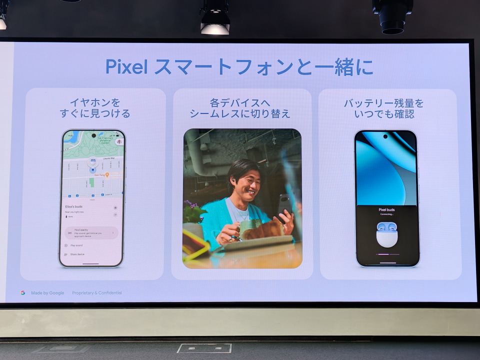 そのほか、Pixelスマートフォンと併用することで、デバイスを探す機能や、デバイス間を素早く切り替えられるFast Pair、バッテリー残量の確認などが行える。
