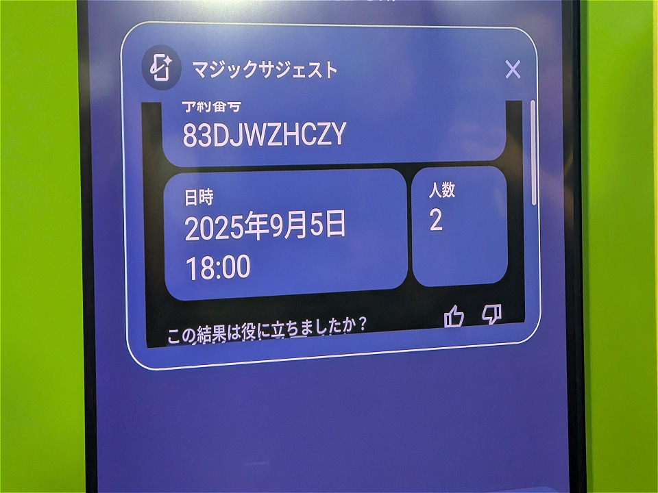 たとえば、「今日のディナーはどこのお店だっけ?」、と友人から質問されると、Geminiがユーザーの予約メールからレストラン名を自動で読み取り、返信候補としてレストラン名をポップアップしてくれる。さらに、レストランに電話を発信すると、予約日時や予約人数など、レストランとのやりとりに必要になる情報をポップアップして表示してくれる。