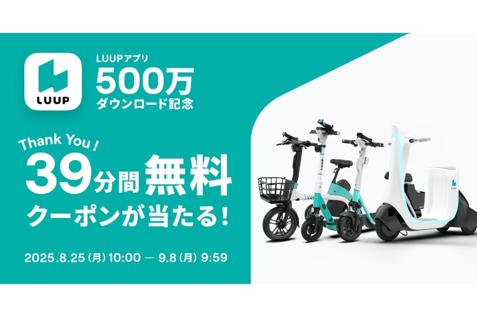 Luupは、公式アプリ500万ダウンロード突破を記念し、抽選で500名にライド料金が39分間無料になるクーポンが当たるキャンペーンを開始した。期間は9月8日9時59分まで。