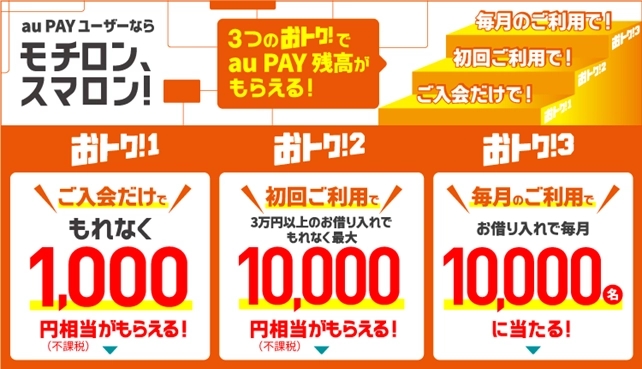 また、契約月の翌月までに合計3万円以上を借り入れると、金額に応じてau PAY 残高が進呈される特典も用意されている。3万円以上で500円相当、20万円以上で2000円相当、50万円以上で5000円相当、70万円以上で7000円相当、100万円以上で1万円相当が加算される。