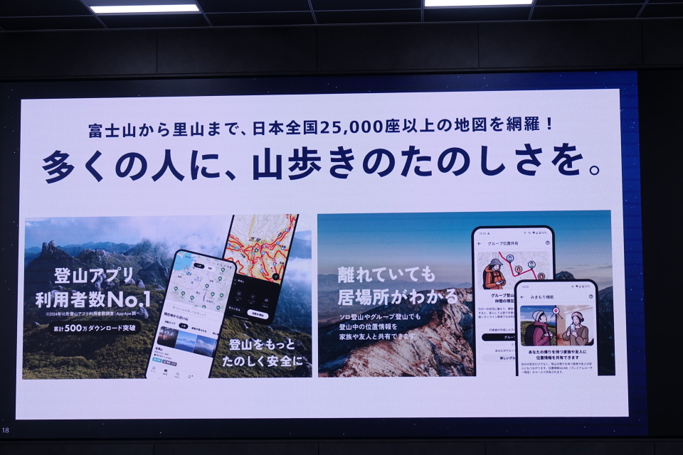 想定する利用の例として、KDDI パーソナル事業本部 マーケティング本部長の手塚嘉一郎氏は「登山」を挙げる。けがや事故の可能性も少なくない登山だが、山間部は携帯電話サービスのエリア外であることも珍しくない。当初、データ通信に対応するアプリのなかには、山中の地図の確認や登山届提出などの機能を持つ「YAMAP」がある。登山中、常にデータ通信できるため遭難リスクの低減や事故時にも外部と迅速に連絡が取れるようになる。