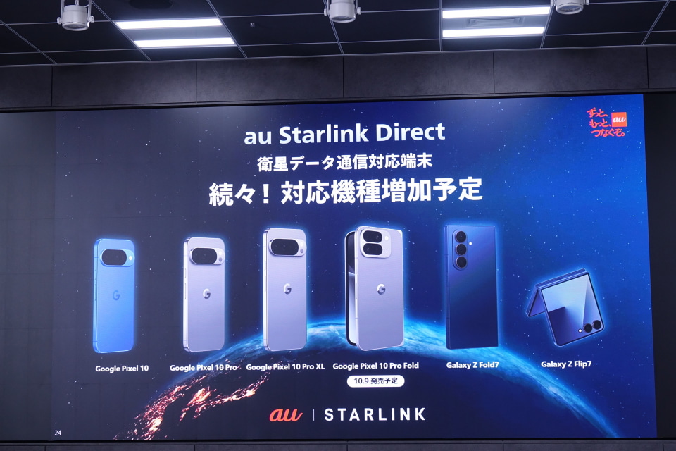 対応する機種はPixel 10、Pixel 10 Pro、Pixel 10 Pro XL、Pixel 10 Pro Fold、Galaxy Z Fold7、Galaxy Z Flip7。対応アプリと機種は順次拡大する。Starlink衛星とスマートフォンの直接通信でデータ通信に対応するのは世界初という。