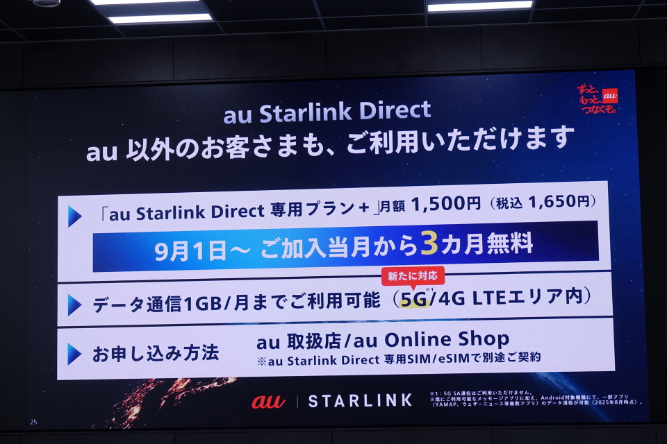 KDDI 取締執行役員専務 パーソナル事業本部長の竹澤浩氏によると、au Starlink Directは、8月26日接続数190万人を超えた。週末にも200万人に達することが見込まれるという。「au Starlink Direct専用プラン+」(月額1650円)を契約することで、auの回線ユーザー以外も利用できる。