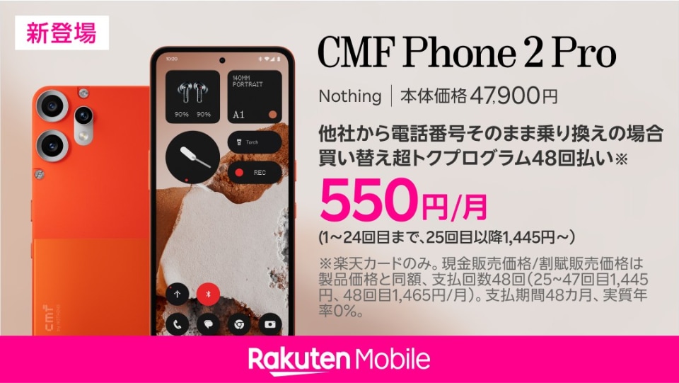 新規で「Rakuten最強プラン」に申し込む場合、1~24カ月目の製品分割価格は、「Phone (3)」が同1750円から、「CMF Phone 2 Pro」が同660円。製品のみ購入の場合、1~24カ月目の製品分割価格は「Phone (3)」が2600円から、「CMF Phone 2 Pro」が880円。