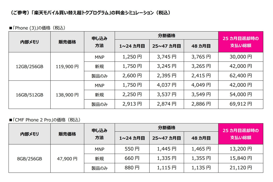 楽天モバイルは、Nothingの新型スマートフォン「Phone (3)」を発売した。あわせて「Phone (3)」および「CMF Phone 2 Pro」を「楽天モバイル買い替え超トクプログラム」の対象製品に追加した。