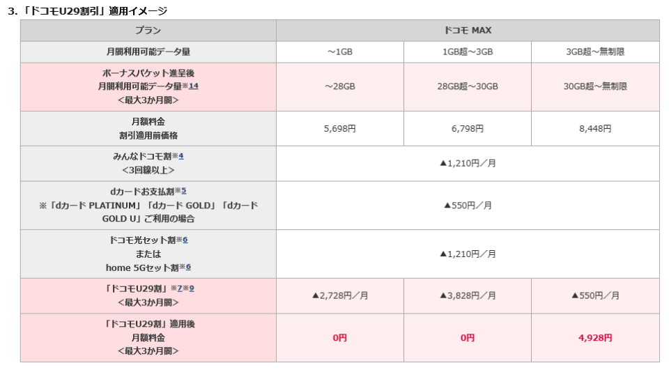 たとえば、月の利用データ量が29GBの場合、ボーナスパケット分を引いた2GBがプランの利用データ量となり、ドコモMAXの「1GB超~3GB」(月額6798円)の区分が適用される。この場合、U29割で月額3828円の割引で2970円となる。これに家族割引「みんなドコモ割(3回線以上)」(-1210円/月)や「dカードお支払い割」(最大-550円/月)、「ドコモ光/home 5Gセット割」(-1210円/月)を組み合わせると、最安0円で利用できる。