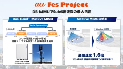 今回のSWEET LOVE SHOWER 2025で、KDDIは2台の移動基地局車を用意。いずれも「Dual-Band Massive MIMO」(DB-MMU)に対応する機材を搭載し、3.7GHz帯と4.0GHz帯を束ねて通信速度を向上させる。帯域を2倍に広げながら、機器のサイズは2割ほど小さく、重量も4割程度削減できる。