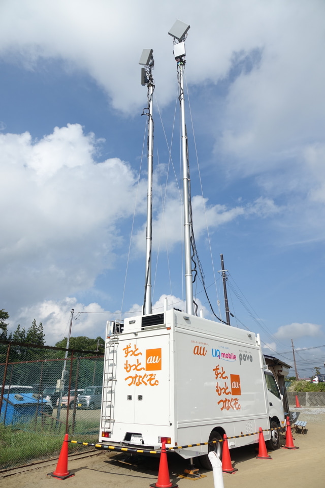 移動基地局車は、他キャリアでも運用されているが、KDDIの会場の北側をカバーする移動基地局車は、他社と異なり、とある私有地に置かれていた。これは会場がスリバチ状になっているため。つまり、他社と同じ位置よりも高い効果を発揮できるのがこの位置だという。
