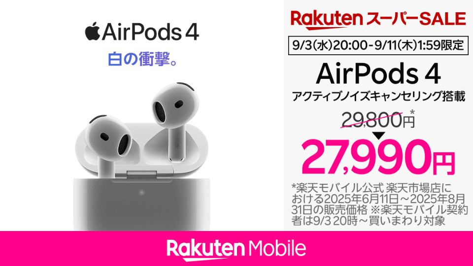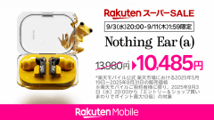 楽天モバイルは、9月3日から開催される楽天スーパーSALEにあわせて、楽天市場内の「楽天モバイル公式 楽天市場店」で「Airpods」シリーズや「Nothing Ear (a)」の割引セールを実施する。期間は9月3日20時~11日1時59分まで。