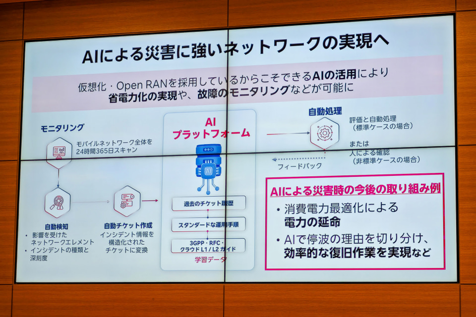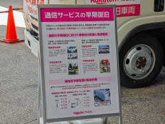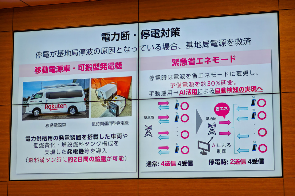 停電(電力断)対策としては、基地局電源確保のため、移動基地局車や移動電源車、可搬型発電機を配備。燃料満タン状態で約2日間給電可能な長時間運用型発電機や、基地局送信電力を抑えて予備電源を約30%延命する緊急省エネモードも導入した。さらにAIを活用した電力最適化により、消費電力の自動制御も可能となる。