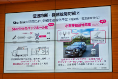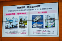 伝送路断や機器故障には、移動基地局車や他社と共同利用の船舶型基地局を活用。加えて、Starlinkアンテナをバックホール回線として利用し、今年度から移動基地局車の半数にStarlinkを搭載する予定。