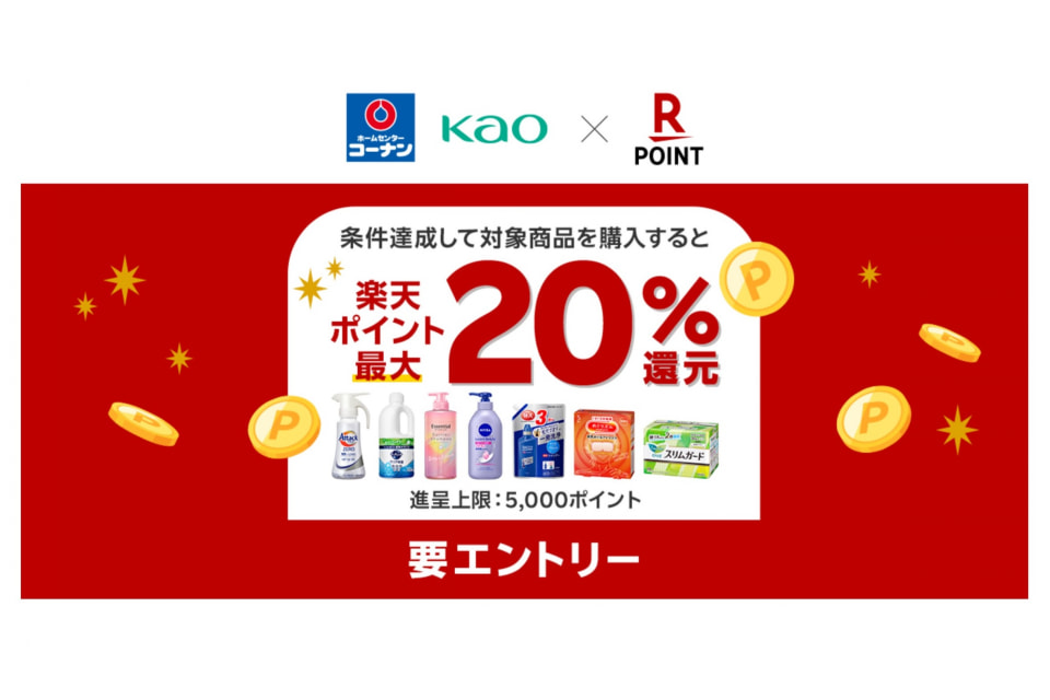 キャンペーン期間中にキャンペーンページよりエントリーのうえ、「ホームセンターコーナン」「コーナンビーバートザン」の店舗で「楽天ポイントカード」を提示し、花王の対象商品を1会計あたり5000円(税込)以上購入すると、対象商品の購入金額(税込)に対して最大20%分の「楽天ポイント」が還元される。