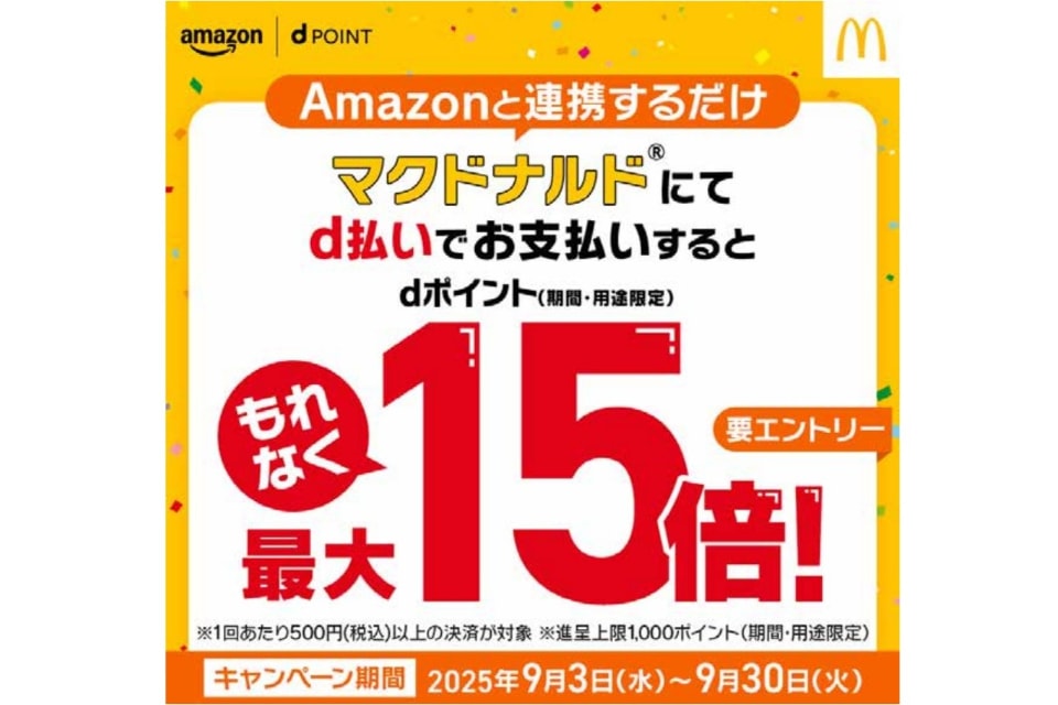 NTTドコモは、「Amazonアカウントとdアカウントを連携するとマクドナルドでもれなくdポイント最大15倍キャンペーン」を開始した。期間は9月30日まで。
