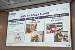 令和6年能登半島地震では、発生から3分後に災害対策本部を立ち上げ、直ちに復旧活動を開始。道路の寸断や余震で現場に入るのが難しい中、輪島市のauショップが入るショッピングセンターにベースキャンプ車両を留めて拠点とした。