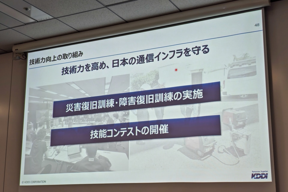 災害対応力を高めるため、年間約1000件の訓練を実施。首都直下地震や南海トラフ地震を想定した全社訓練には、技術部門だけでなく営業や広報も参加し、復旧体制から周知方法までを検証している。2018年からは技能コンテストを行い、車載基地局やStarlink設営のスピードと安全性を競う取り組みも続けている。