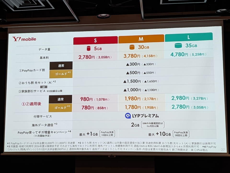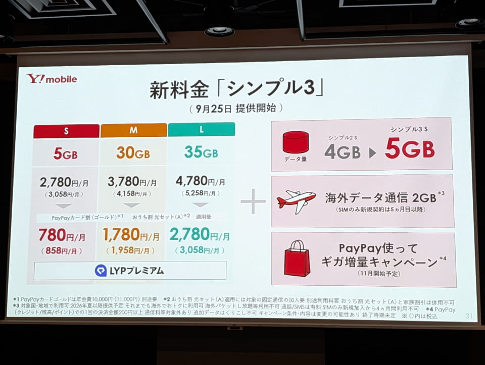 新料金プラン「シンプル 3」では、プランSのデータ容量が4GB→5GBに増量されたほか、海外データ通信が2GB/月まで無料(2026年夏以降、条件あり)で利用できる。月額料金は値上げされたが、PayPayカード割や自宅の固定回線、家族割引の割引額が拡大され、これらすべて適用した際の価格は、既存の「シンプル2」と同額になる。また、PayPayカード ゴールドで支払うと、割引が220円/月増額され、既存プランより安くなる。