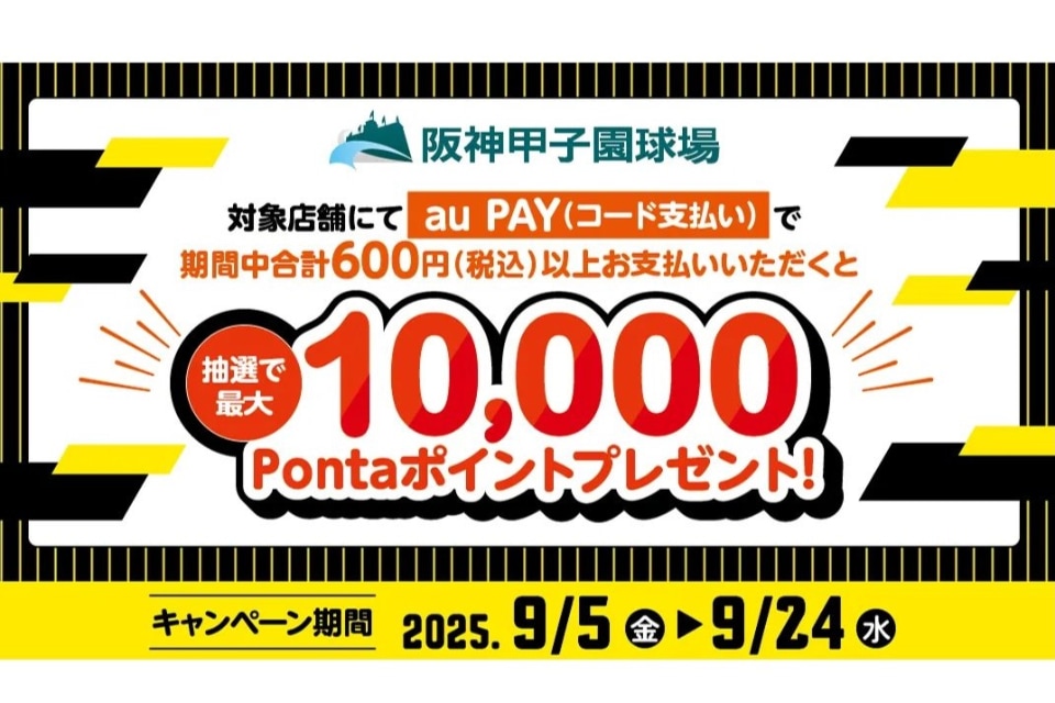 スマホ決済サービス「au PAY」を阪神甲子園球場の対象店舗で利用すると、抽選で最大1万ポイントがプレゼントされるキャンペーンが始まった。期間は24日まで。