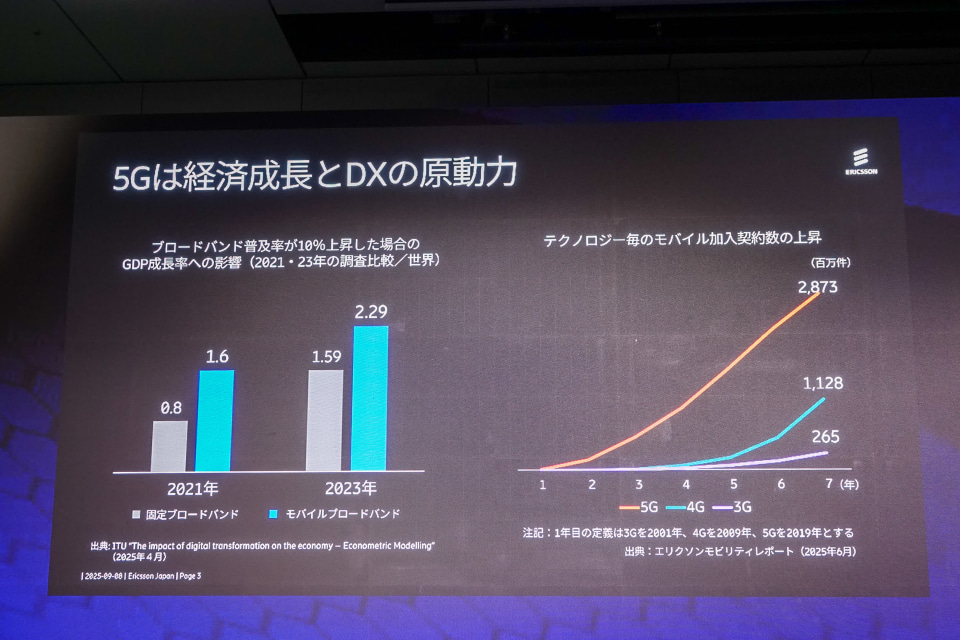 5Gの普及スピードは過去世代を大きく上回っており、7年目には28.7億契約に達すると見込まれる。スマートフォンの浸透やアプリ経済の発展に加え、5Gがもたらす価値が明確になったことが、この急速な拡大を後押ししていると説明した。
