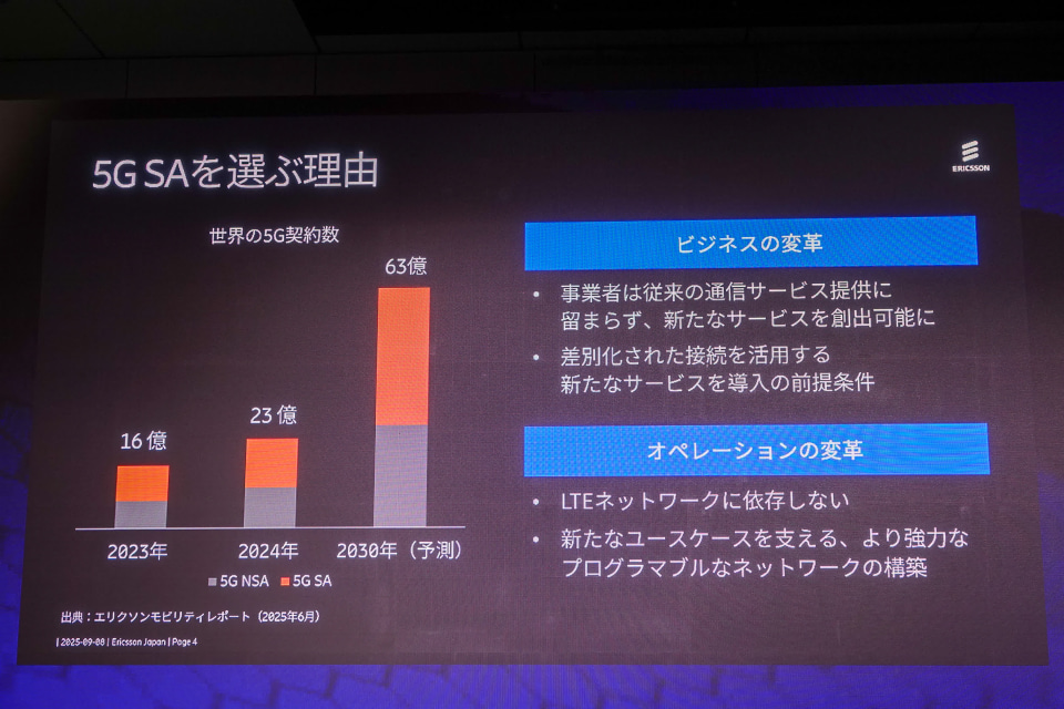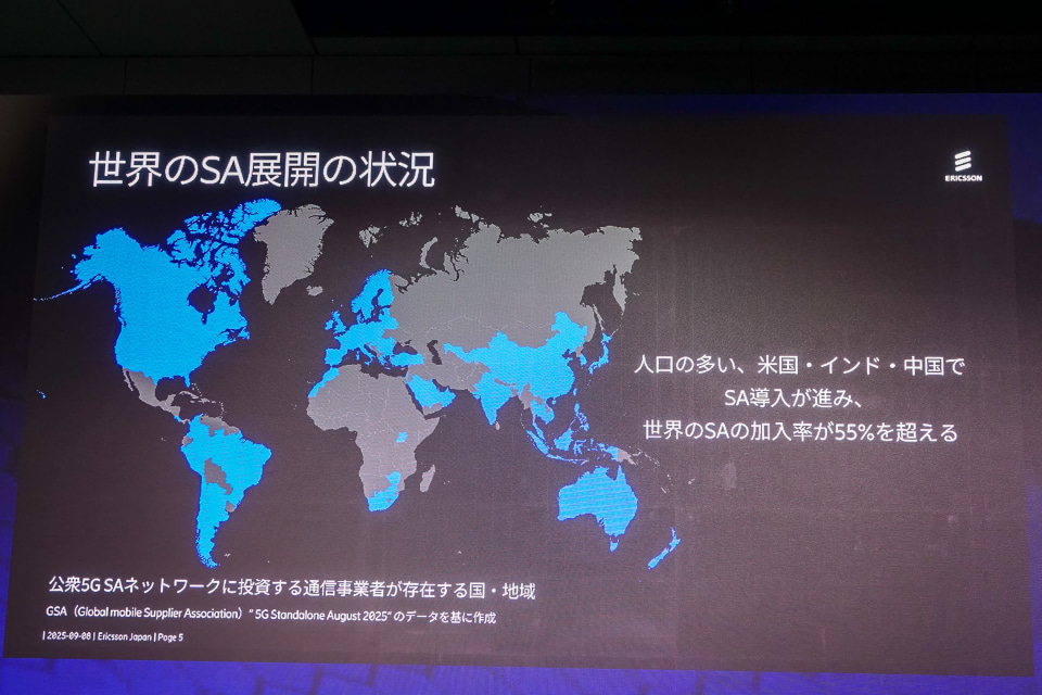 特に5G SA(Stand-Alone)の重要性を強調。5G SAは新たな収益機会や効率的な運用を可能にし、ネットワークスライシングや自動化による利点も大きい。中国の通信事業者やインドのJio、米国のT-Mobileなどが積極的に展開しており、多くの5G利用者がすでにSAネットワークを利用している。