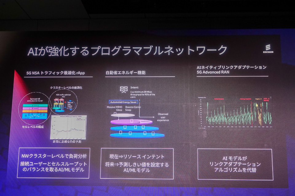 将来に向けては、AIによるネットワーク最適化が進んでいる。トラフィック負荷を予測して最適化する「5G NSAトラフィック最適化 rApp」、スループットを維持しつつ消費電力を抑える「自動省エネ機能」、そして20年以上改良されてきたアルゴリズムにさらなる改善をもたらす「AIネイティブリンクアダプテーション」などが開発されている。
