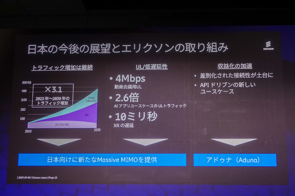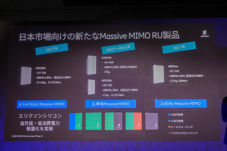 これに対応するため、エリクソンは日本市場向けのMassive MIMO無線機を強化。軽量な4.5/4.9GHz帯モデルに加え、3.5~4GHz帯をカバーする広帯域モデルを2025~26年に投入し、2027年には2.6GHz帯モデルも導入する計画。エリクソンシリコンを搭載し、無線機内で直接処理することで低遅延かつ高いアップリンク性能を実現する。