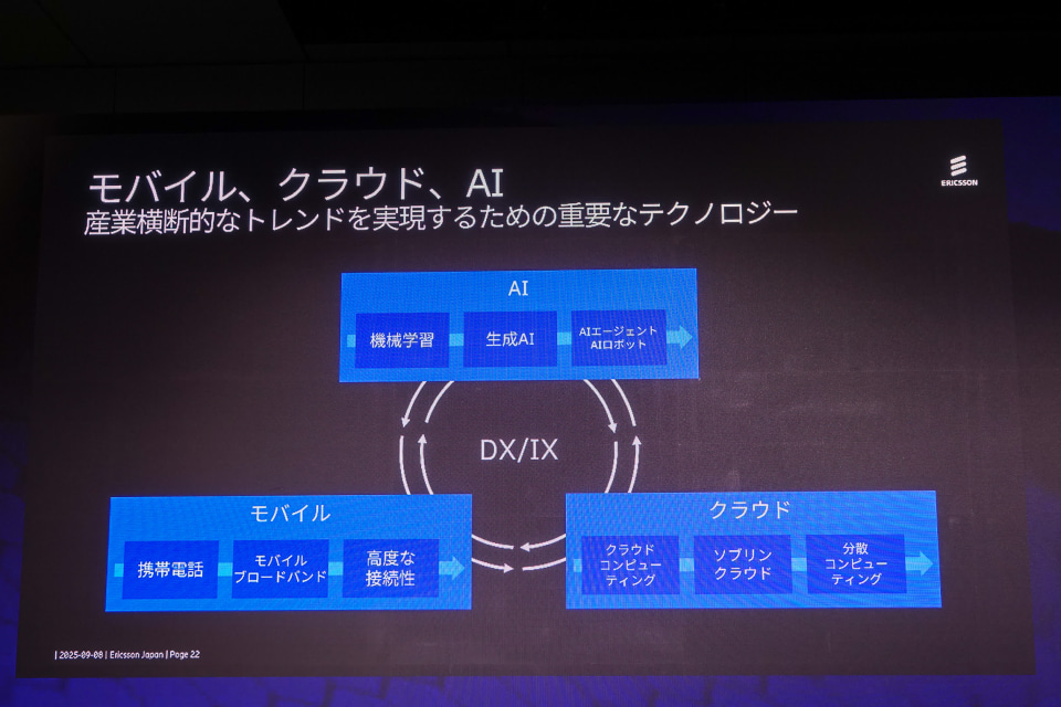 エリクソンジャパンの鹿島毅CTOは、ネットワークが多様な形で利用され、特に産業DXの加速においてモバイルが重要な要素となっていると説明。AI、クラウド、モバイルの活用は互いに連携して進化しており、ネットワークはそれぞれの利用形態に合わせて最適な形で構築されるべきであると話す。