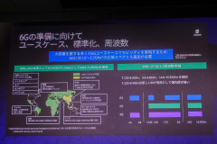 その実現に不可欠なのが周波数確保であり、6Gには約2GHzの追加帯域が必要とされる。WRC-23ではアッパー6GHz帯や7~8GHz帯がIMT向けに議論されており、日本でも早急な検討が必要だと述べた。