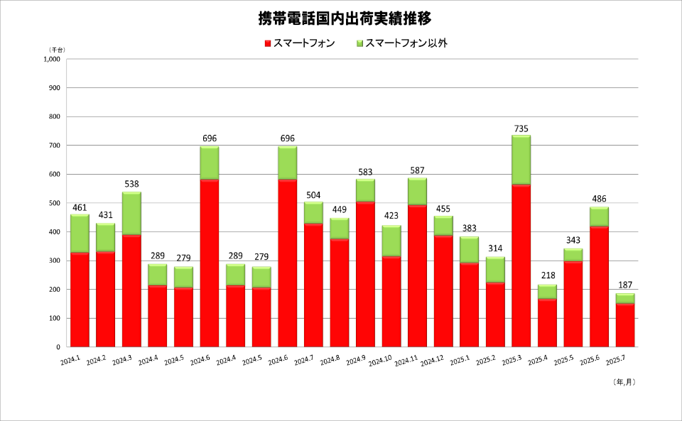 電子情報技術産業協会(JEITA)と情報通信ネットワーク産業協会(CIAJ)は、国内メーカーによる、7月の携帯電話出荷台数を発表した。携帯電話は18万7000台、うちスマートフォンは15万2000台だった。