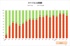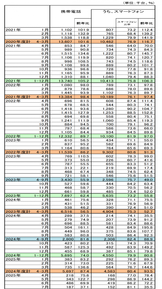 4月からの累計での携帯電話出荷台数は123万4000台で前年比69.8%、スマートフォンだけで見ると103万7000台で前年比72.5%となり、スマートフォン比率は81.1%だった。