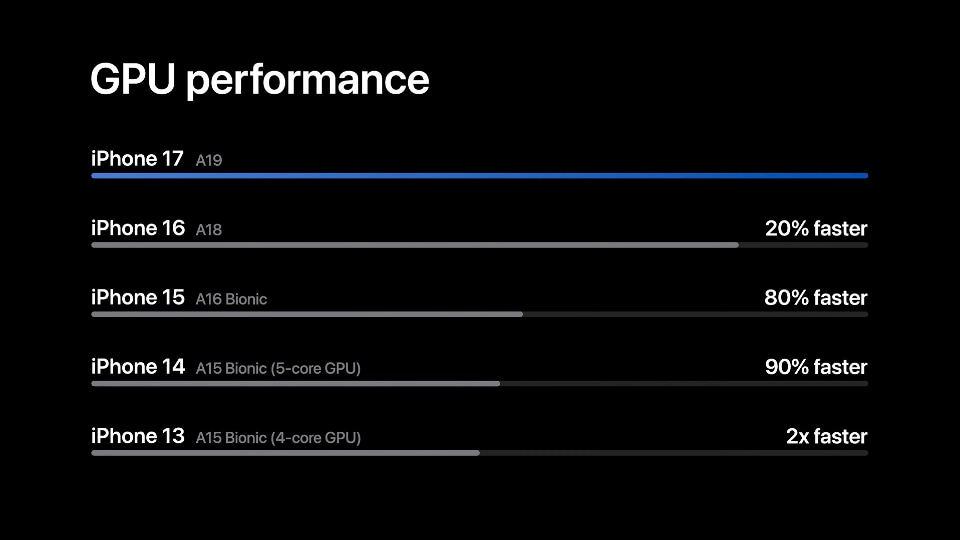 グラフィックを処理するGPUは5コアで、前モデルの「iPhone 16」比で20%、A15 Bionicを搭載する「iPhone 13」比では2倍の処理速度を実現した。メモリーの帯域幅が広くなったことでデータのやり取り速度が上がり、オンデバイスの大規模言語モデル(LLM)などの実行速度が向上した。
