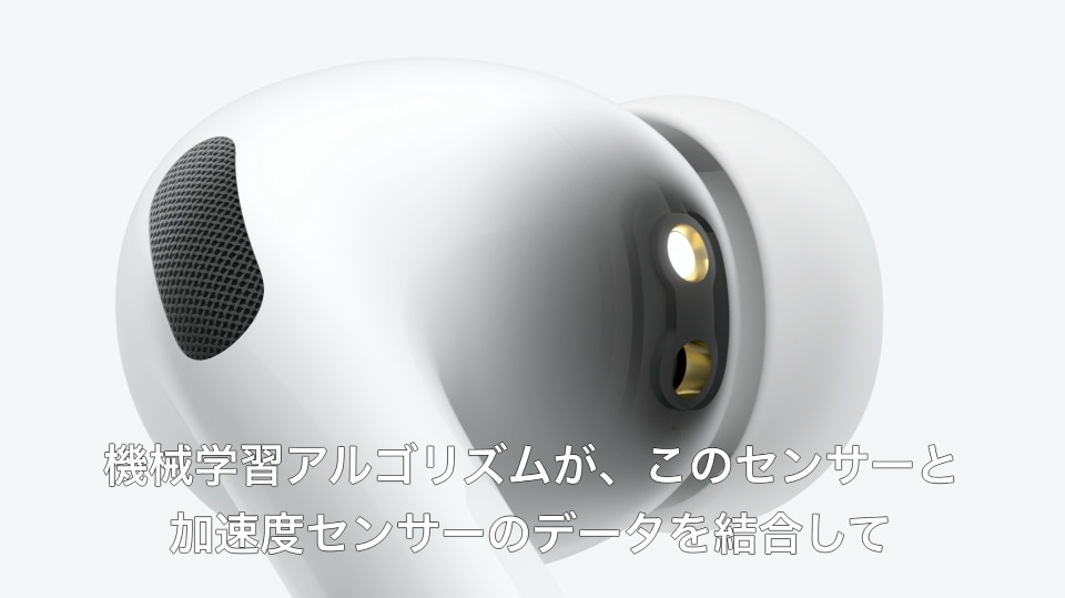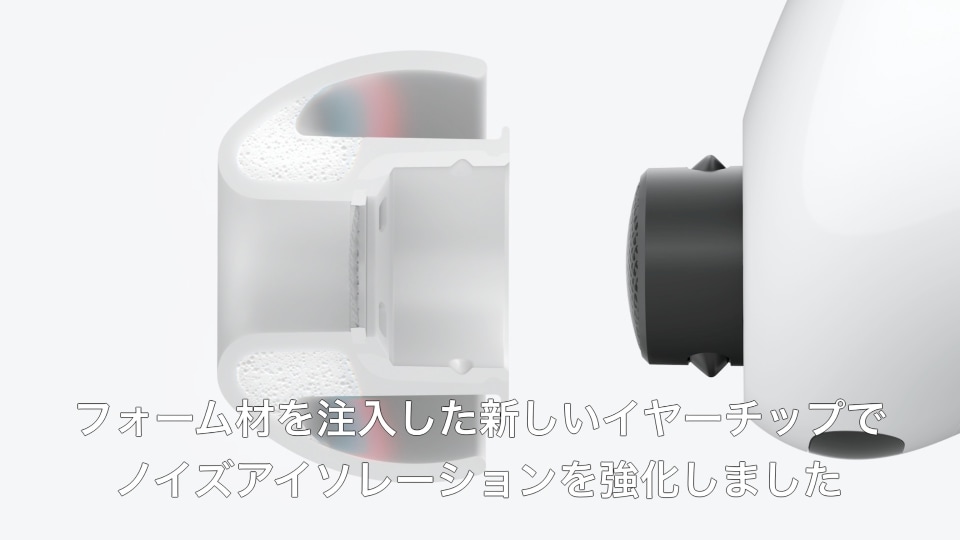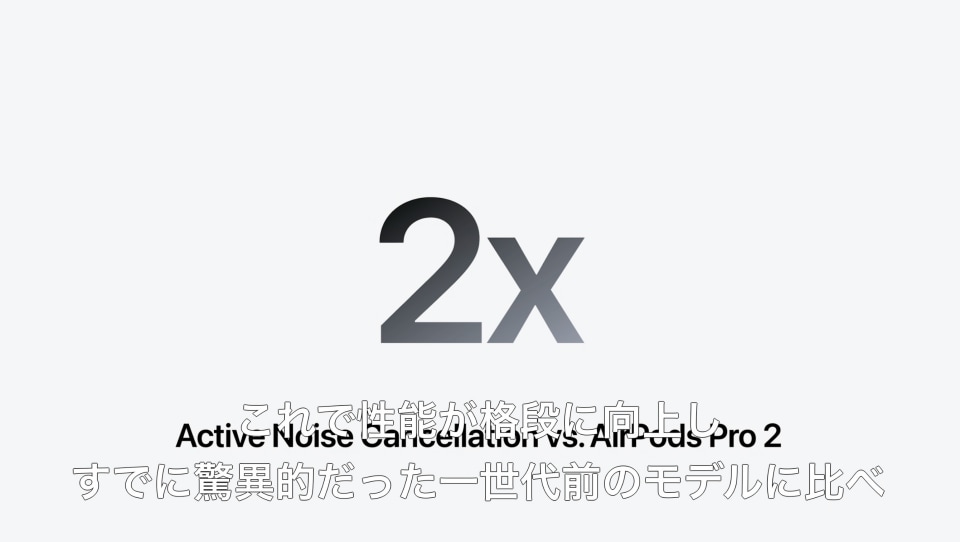 アクティブノイズキャンセリング(ANC)機能は、前モデル比で最大2倍、初代AirPods Pro比では4倍のノイズ除去ができる。超低ノイズのマイクと、先進的なコンピュテーショナルオーディオによって実現した。