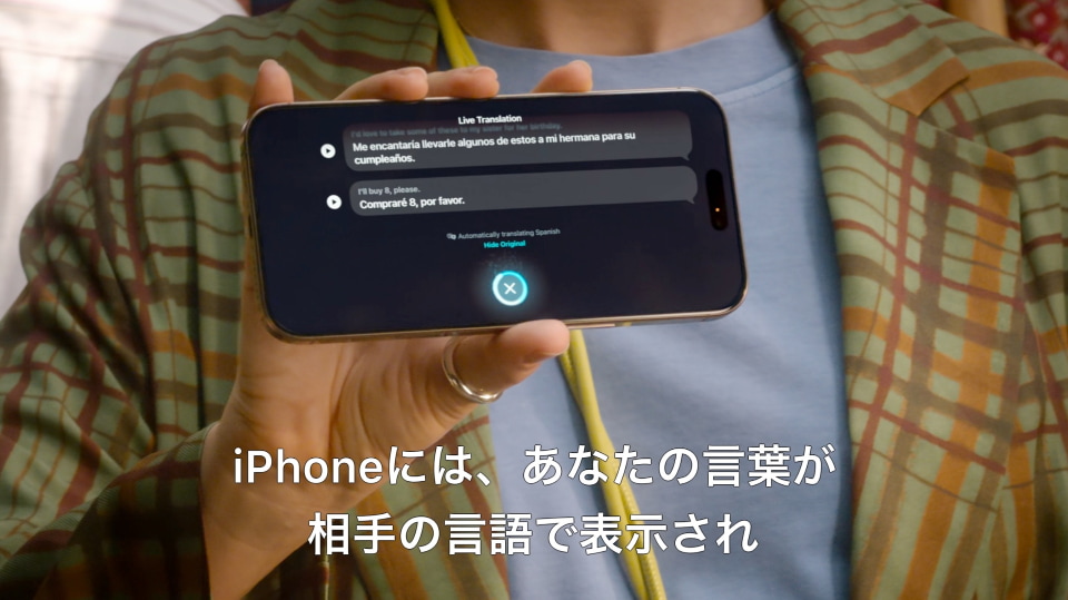 Apple Intelligenceを活用した機能として、ライブ翻訳のベータ版が利用できるようになる。ライブ翻訳を有効にした状態で話すことで、対話相手の音声が、自分の設定した言語に翻訳される。iPhoneを水平ディスプレイとして使用し、対話相手の言語へと、自分の発言を翻訳するライブ文字起こし機能を合わせて活用することもできる。