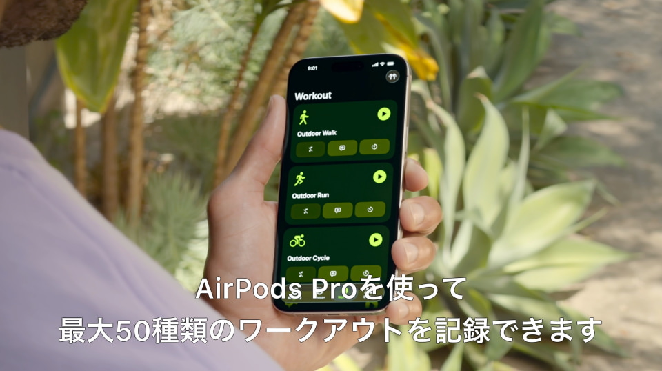 AirPods Pro 3では、カスタム心拍センサーや、目に見えない赤外線を毎秒256回パルスで照射し、血流中の光の吸収を測定するカスタムフォトプレチスモグラフィー(PPG)センサーを導入。加速度計、ジャイロスコープ、GPS、iPhoneのオンデバイスAIモデルのセンサーフュージョンと組み合わせることで、最大50種類以上のワークアウトを開始したり、心拍数と消費カロリーの記録ができる。