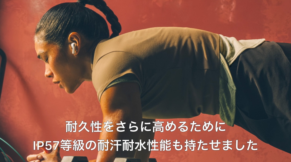 また、AirPodsシリーズとしては初となる、IP57等級の耐汗耐水性能を有するため、汗や雨にも強くなっている。