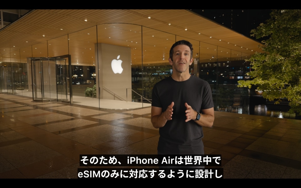 10日に開催された「Apple Event」では、新型iPhoneとして「iPhone Air」「iPhone 17」「iPhone 17 Pro」「iPhone 17 Pro Max」が発表された。「iPhone Air」の紹介シーンでは「eSIMのみに対応するように設計」したことが明言されていた。