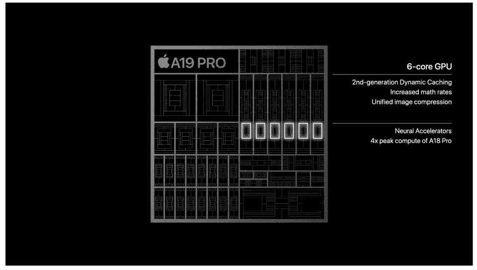 チップセットは「A19 Pro」で、6コアのCPUと高性能な6コアGPUを搭載する。それぞれのGPUコアが「A18 Pro」と比べて4倍のピーク性能のNeural Acceleratorを内蔵する。具体的な容量については明かされていないが、「A18 Pro」との比較でキャッシュやメモリ(RAM)も増加しているという。